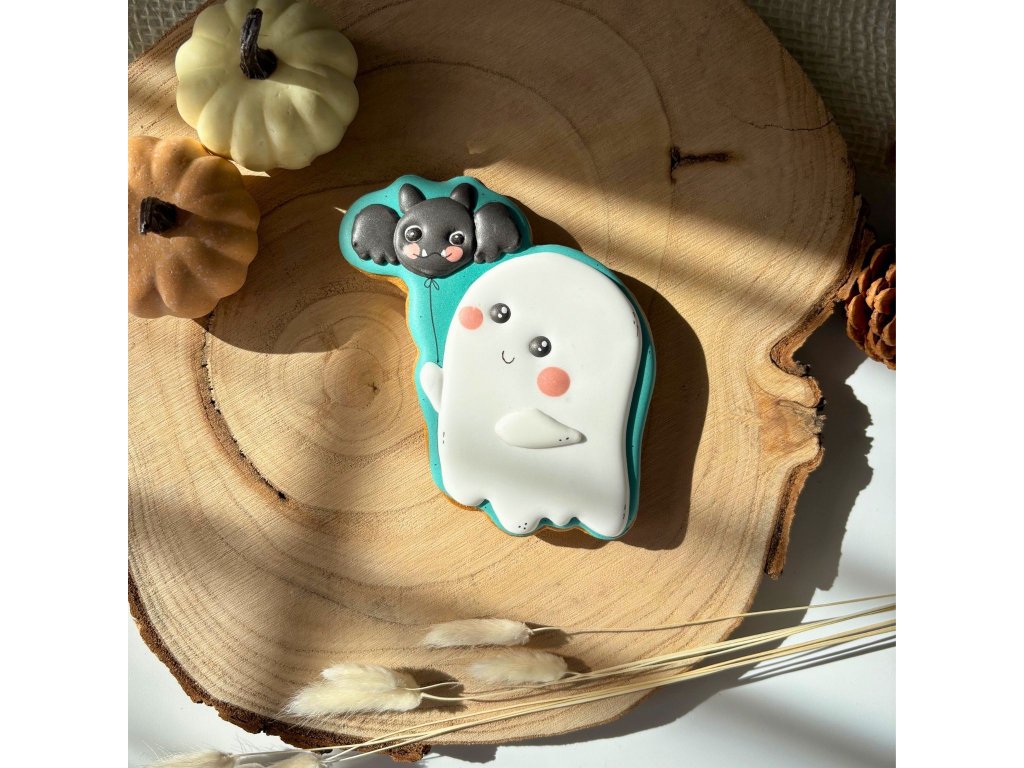 Veselý strašiduch s balonkem – halloweenský perníček 🎈I duchové si umí užít zábavu! Tento roztomilý halloweenský perníček zobrazuje veselého bílého ducha, který drží balónek ve tvaru netopýra – zábavná kombinace, která potěší všechny, kteří chtějí oslavit Halloween s úsměvem.