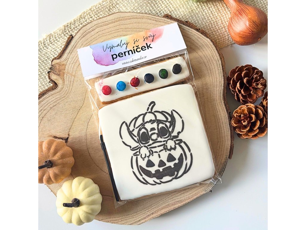 1× perníček s motivem chlupatého experimentu vylézajícího z dýně (cca 12 × 12 cm)