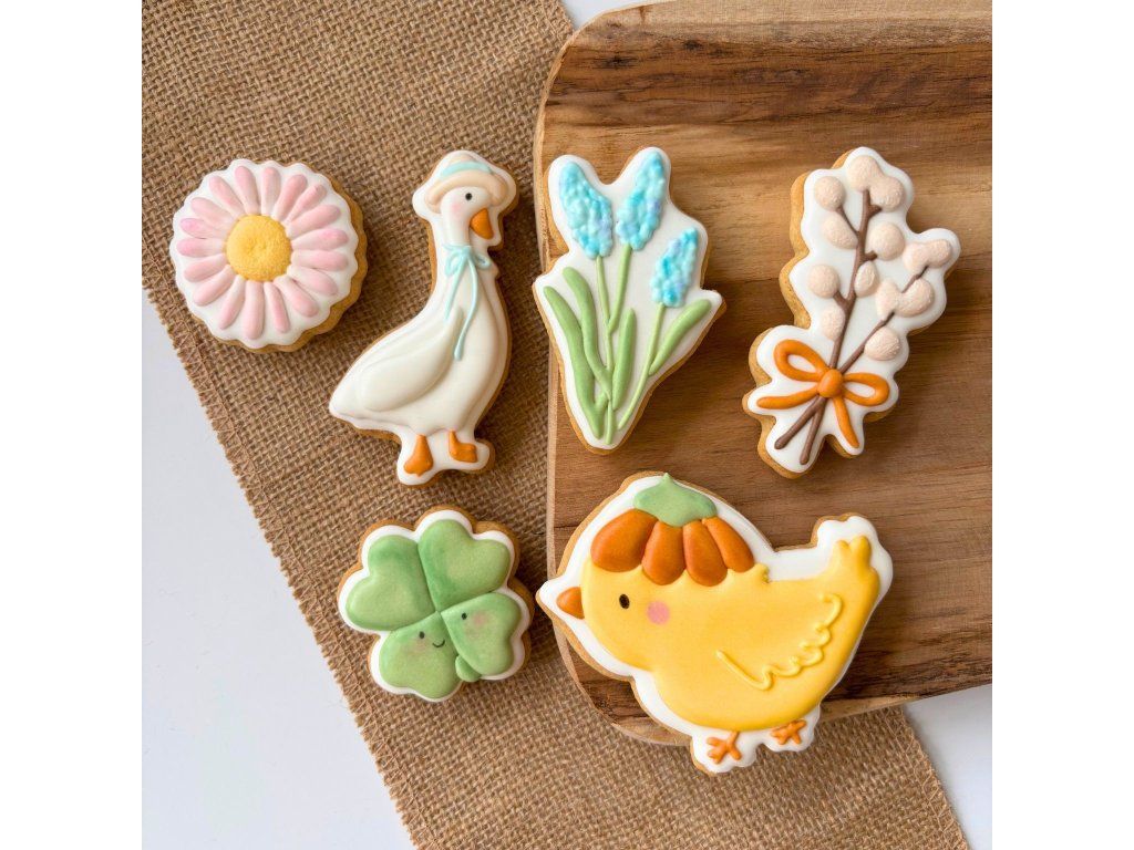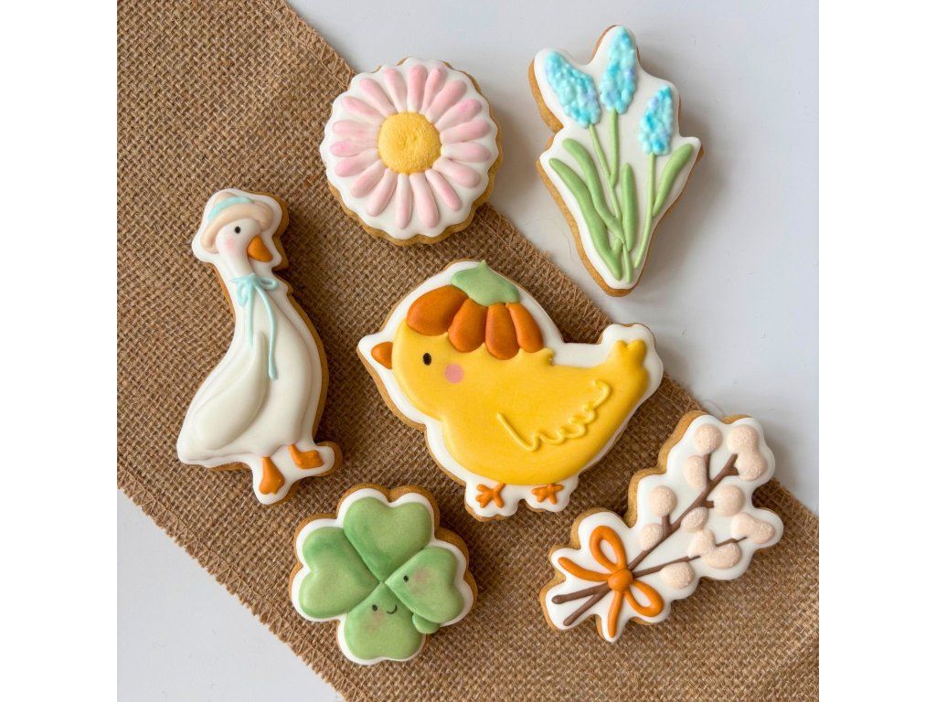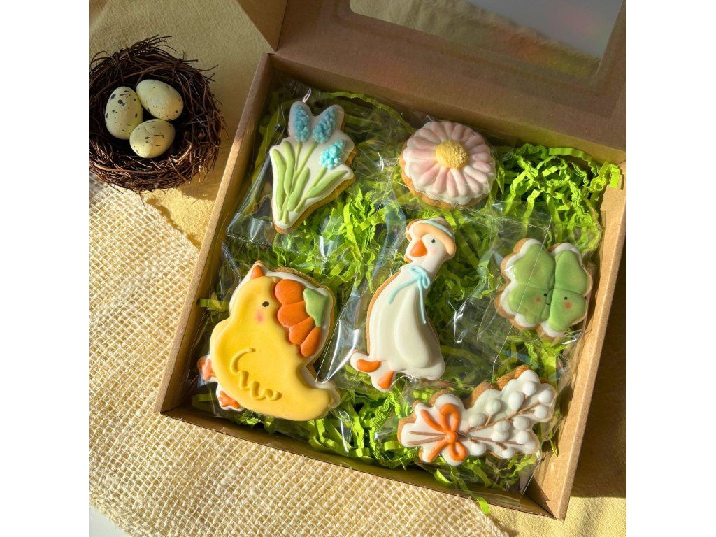 Velikonoční set obsahuje 6 ručně zdobených perníčků o velikosti 6–9 cm (nejdelší strana) s roztomilými jarními motivy: