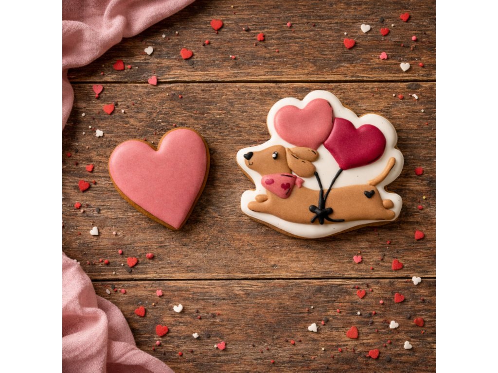 Rozkošný valentýnský set perníčků kombinuje klasické srdíčko a roztomilého pejska, který se vznáší díky balónkům ve tvaru srdíček. Každý perníček je ručně zdobený královskou glazurou, s precizním důrazem na detail, barvy a jemné linie, aby výsledek byl hravý a něžný zároveň.