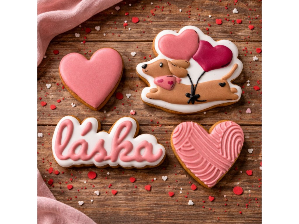 Roztomilý valentýnský set perníčků kombinuje vše, co k vyznání lásky patří: nápis Láska, dvě srdíčka a zamilovaného pejska s balónky ve tvaru srdcí. Každý perníček je ručně zdobený královskou glazurou, s jemnými detaily, hravými barvami a precizním provedením, aby dar působil sladce, originálně a elegantně.